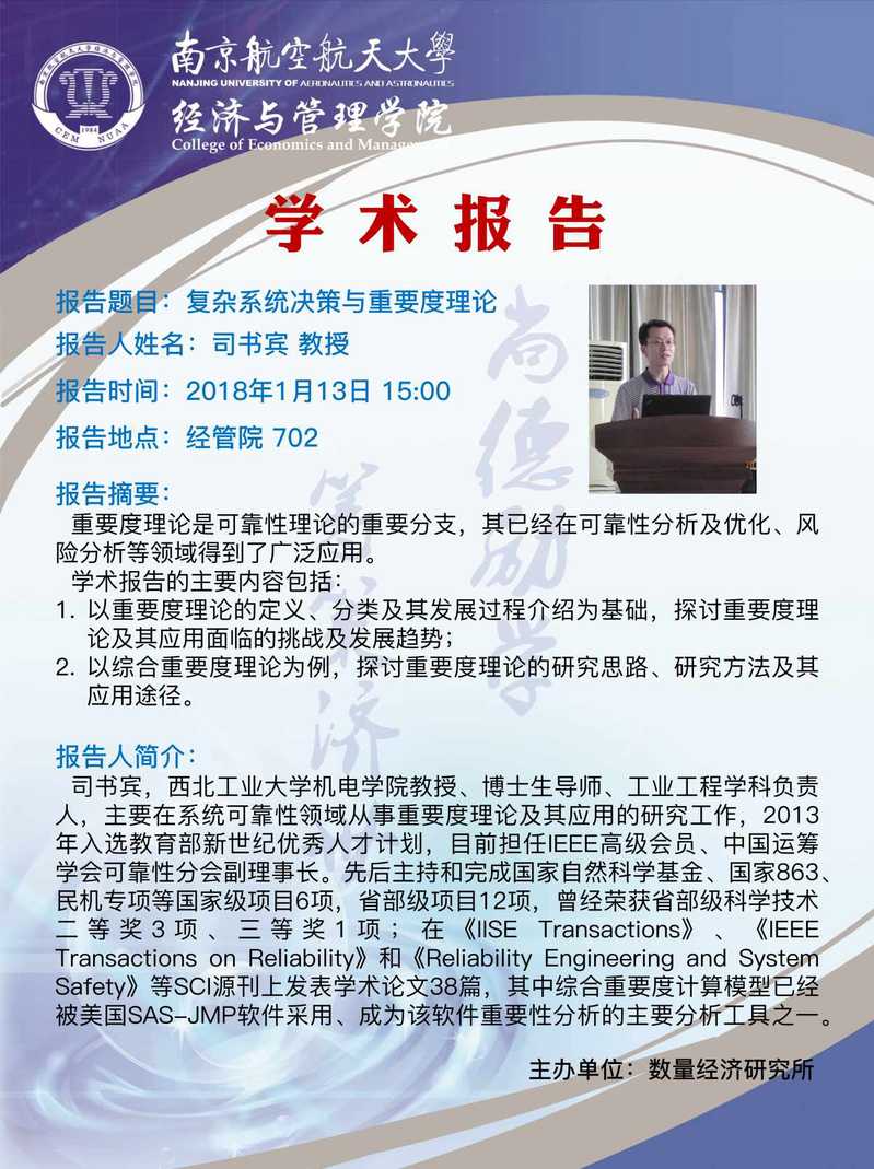作者简介:司书宾,西北工业大学机电学院教授、博士生导师、工业工程学科负责人,主要在系统可靠性领域从事重要度理论及其应用的研究工作,2013年入选教育部新世纪优秀人才计划,目前担任IEEE高级会员、中国运筹学会可靠性分会副理事长。先后主持和完成国家自然科学基金、国家863、民机专项等国家级项目6项,省部级项目12项,曾经荣获省部级科学技术二等奖3项、三等奖1项;在《IISE Transactions》、《IEEE Transactions on Reliability》和《Reliability Engineering and System Safety》等SCI源刊上发表学术论文38篇,其中综合重要度计算模型已经被美国SAS-JMP软件采用、成为该软件重要性分析的主要分析工具之一。