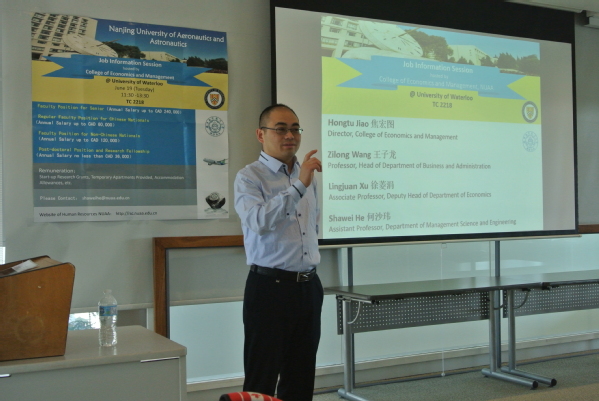 6月19日,学院代表团在加拿大滑铁卢大学William Tatham中心举行了海外人才专场招聘会。基于前期做了精心的宣传,本次招聘会吸引了滑铁卢大学及周边高校经管、应用数学、系统工程等专业的在读博士和应届博士毕业生参加,除有在加攻读博士学位的中国籍留学生到场参加外,更能见到加拿大等外籍博士生。