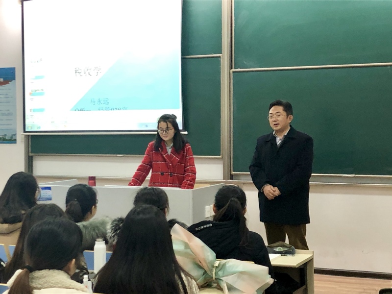 当天上午,在2017级会计学专业的《税收学》课前,周德群向同学们介绍了马永远老师的学习经历、科研经历等基本情况;作为西安交通大学、香港城市大学联合培养的博士,马永远在求学期间成绩优异,发表多篇高质量论文,科研成果丰硕,多次获得各类奖学金,2018年博士毕业后应聘至91麻豆 工商管理系任专业教师。周德群建议同学们积极向马老师请教、学习,在夯实基础学业的同时,培养科研兴趣,尝试进行学术研究。他也勉励马永远老师尽快完成从学生到教师的角色转变,潜心教学,将教授课程打造成学生喜欢的“金课”。