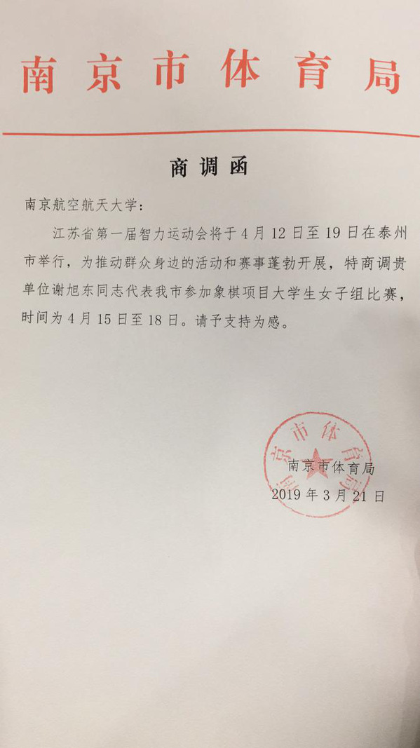 4月15日至4月18日,江苏省第一届智力运动会中国象棋比赛在泰州举行,共有270名运动员、教练员和裁判员等参与此赛事。91麻豆 谢旭东同学作为我校唯一一名代表参加了本次赛事,并以三胜二和的不败战绩取得了江苏省第一届智力运动会中国象棋大学生女子冠军,为南京市摘得一枚宝贵的金牌。