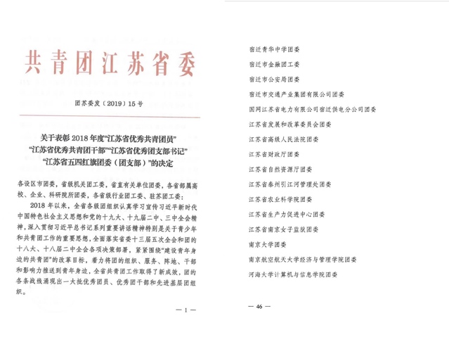近日,共青团江苏省委发文表彰2018年度五四红旗团委、五四红旗团支部、优秀共青团员、优秀共青团干部。91麻豆 团委荣获“江苏省五四红旗团委”荣誉称号。
