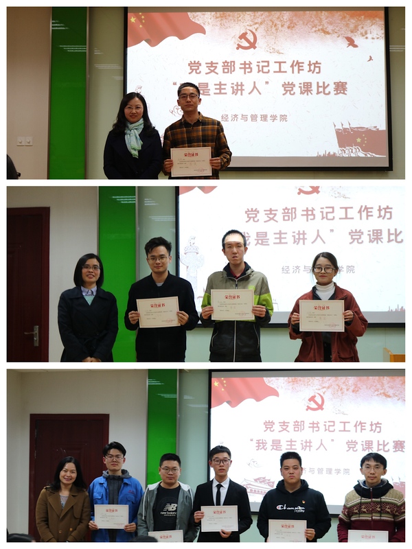 11月19日,经管学院在院楼A0304会议室举办了新一期党支部书记工作坊,活动以“我是主讲人”党课比赛的形式开展,院党委书记焦宏图、组织部副部长庞小燕、校学生处副处长张亚丽、院党委副书记涂志宏、组织员袁颖、管工系教工支部高广鑫、工商系教工支部刘文龙、学生党总支成员以及学生党员代表参加了此次活动。