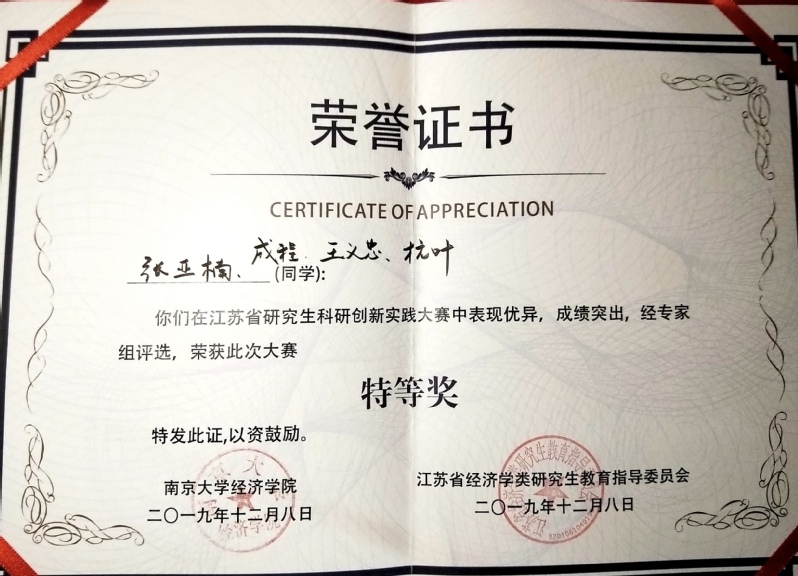 2019年江苏省研究生创新型经济发展创新实践大赛由江苏省经济学类研究生教育指导委员会主办,南京大学经济学院承办,鼓励参赛选手以经济学理论为基础,积极投身当代中国经济发展中的重大现实问题的研究和探索进行学科交叉研究,开拓思路,大胆创新。