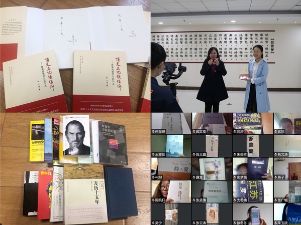 在学院标志性的“经管梦之墙”前,焦宏图将我校马克思主义学院徐川书记亲笔签名的著作《顶天立地谈信仰》赠送给毕业生党员,在视频连线的另一端,44名党员毕业生也纷纷准备了自己为学院图书馆准备的捐赠书籍。书籍互赠既承载着学院对优秀毕业生的殷切期望,也代表了党员毕业生们对学院的庄重承诺。