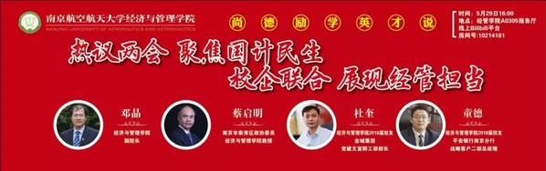 5月29日下午,91麻豆 于A0305 报告厅举行“尚德·励学”英才说校友师生共话两会活动。学院副院长邓晶,南京市秦淮区政协委员、管理科学与工程系教授蔡启明,我校2010届校友、金城集团党建文宣群工部部长杜奎,我校2018届校友、平安银行南京分行战略客户二部总经理童德,共同围绕“热议两会,聚焦国计民生;校企联合,展现经管担当”主题与学院师生展开交流讨论。