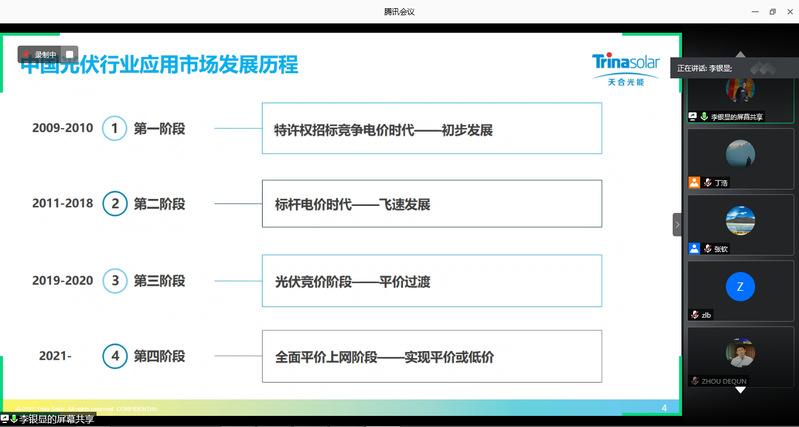 天合光能市场部总监李银显围绕中国光伏政策的发展现状及趋势展开了分析,他指出了我国光伏发电政策发展的四个阶段,并对一些关键政策的目标、对企业界的影响以及存在的主要问题做出了详细的具有针对性的介绍。