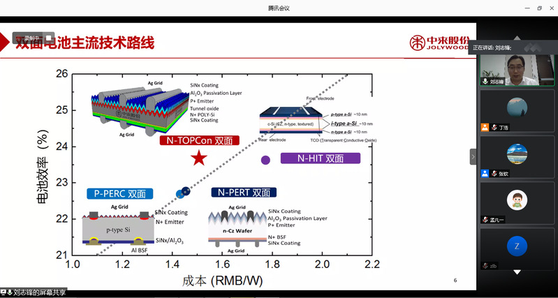泰州中来光电科技有限公司副总经理刘志峰从光伏电池技术发展趋势的角度出发,对不同类型的光伏电池的技术研发效率、实验室成本和量产成本等进行了分析,并对N型双面钝化接触技术的未来发展趋势进行了展望。