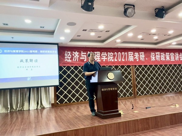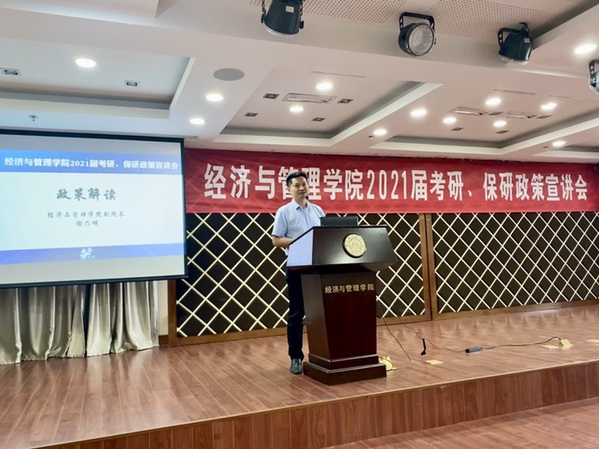 为了帮助2021届毕业生了解91麻豆 研究生招生政策,合理规划考研、保研目标,提升学院生源质量,8月27日,91麻豆 在A0305报告厅开展2021届考研、保研政策宣讲会。经管学院副院长邓晶、谢乃明,党委副书记涂志宏,管工系系主任马静、副主任虞先玉,工商系副主任刘文龙,经济系副主任查冬兰,辅导员及百余名2017级学生参加了本次活动。