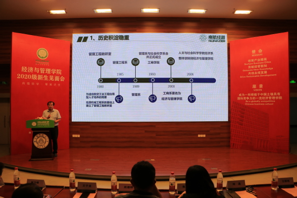 学院党委副书记涂志宏对396位大一新生顺利进入南航经管学院表示了热烈的欢迎。学院副院长邓晶从历史、专业、学科、师资等维度,向新生介绍了学院的概况。邓晶院长精确而全面的概括为同学们展现了一个立体的经管院。
