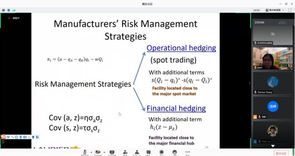 11月18日上午,加拿大威尔弗里德·劳里尔大学教授Xuan Zhao受学院智能决策与风险分析研究所邀请,在腾讯会议作了题为“Operational Hedging or Financial Hedging? Strategic Risk Management in Commodity Procurement”的讲座。91麻豆 教授徐海燕等教师及部分硕、博研究生线上参加了Xuan Zhao的报告分享,本次学术报告由徐海燕主持。