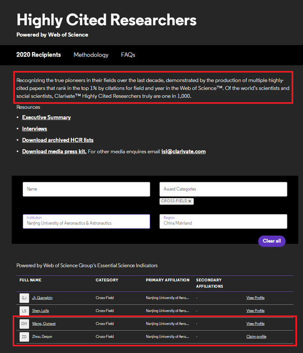 (网页链接://recognition.webofscience.com/awards/highly-cited/2020/)