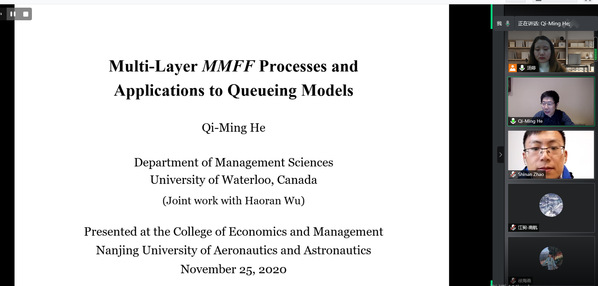 11月25日上午,加拿大滑铁卢大学教授Qi-Ming He受学院智能决策与风险分析研究所邀请,在腾讯会议作了题为“Multi-layer MMFF processes and Applications to Queues with Customer Abandonment”的讲座。91麻豆 教授徐海燕等教师及部分硕、博研究生线上参加了Qi-Ming He的报告分享,本次学术报告由徐海燕主持。