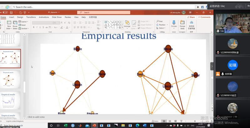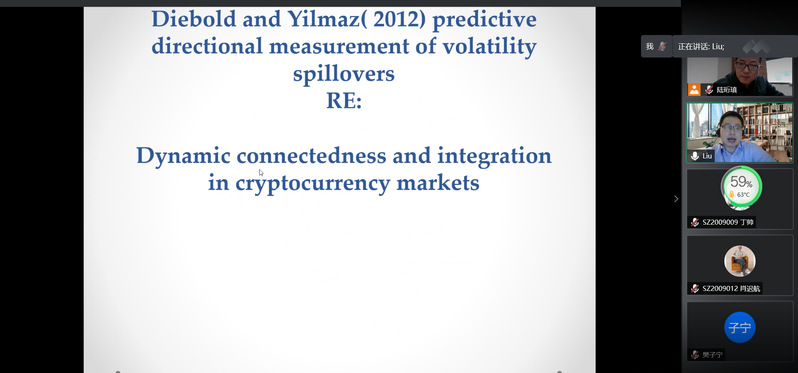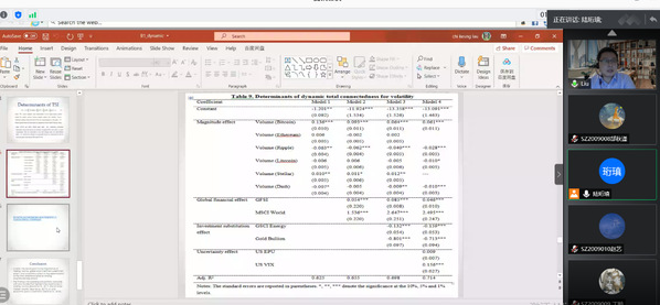 Marco的学术报告拓展了学院师生关于加密货币市场的波动性溢出研究的认识,丰富了师生的研究方向。线上师生与Marco就加密货币及波动溢出问题积极讨论,收获颇丰。