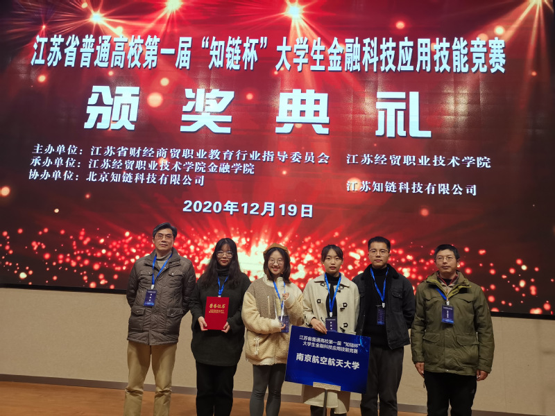 2020年12月19日,江苏省普通高校第一届“知链杯”大学生金融科技应用技能竞赛在江苏经贸职业技术学院举办,本次竞赛由江苏省高等教育学会认定,江苏省教育厅委托江苏省财经商贸职业教育行业指导委员会主办,南航、河海、南农等省内50余院校60团队300师生参赛。通过激烈地角逐,91麻豆 代表队获得了本次大赛的本科组团体一等奖。