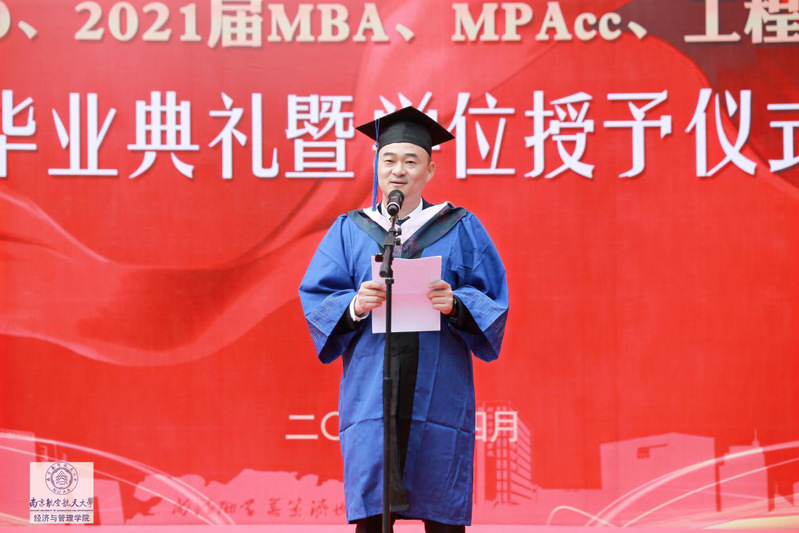 杜兴敏、刘禹兴分别代表MBA和MPAcc毕业生发言。杜兴敏同学是亚太地区商学院沙漠挑战赛南航智行队的队长,带领全体队员荣获“沙鸥奖”,他结合自己的求学经历,分享了自己在南航的收获,讲叙了自己与南航之间动人的故事。重返课堂,是一次归途,更是一场自我管理、组织协调、健康习惯养成的修炼历程。他非常感谢母校的培养,毕业之际,心底涌现深深不舍!刘禹兴感谢老师们让她学到了做人做事的道理,是南航给予自己追求梦想的勇气,给予自己广阔的平台。刘禹兴表示一定不忘初心、努力奋斗,不辜负母校的期望。