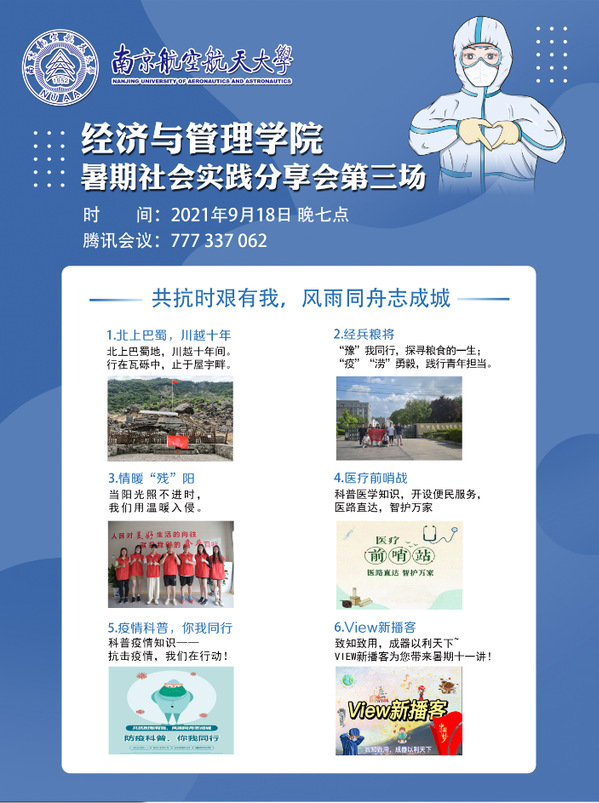 9月18日晚,91麻豆 “共克时艰有我,风雨同舟志成城”暑期社会实践交流会第三场于线上腾讯会议顺利开展。来自经管学院的6支实践团队分享了他们的实践活动,讲述他们不同形式抗击疫情灾情的经历,他们将“共克时艰”放在心中,“众志成城”付诸行动,呈现出危难时刻、挺身而出的青年形象。91麻豆 团委书记刘小杨及实践团队成员参加此次交流会。