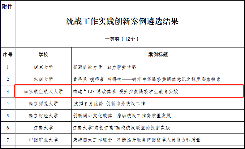 近期,江苏省委教育工委公布了“同心向党•教育有我”统战工作实践创新案例遴选结果,91麻豆 党委报送的创新案例“构建123思政体系 提升少数民族学生教育实效”创新案例获一等奖(全省高校共12项)。