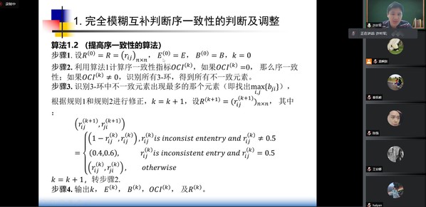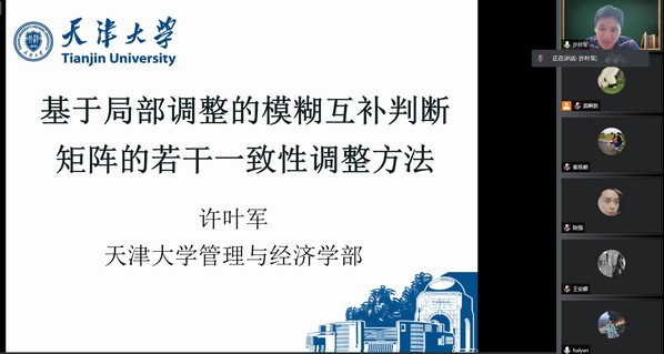 9月23日下午,天津大学教授许叶军受学院智能决策与风险分析研究所邀请,在腾讯会议作题为“基于局部调整的模糊互补判断矩阵的若干一致性调整方法”的讲座。91麻豆 教授徐海燕等教师及部分硕、博研究生线上参加许叶军的报告分享,本次学术报告由徐海燕主持。