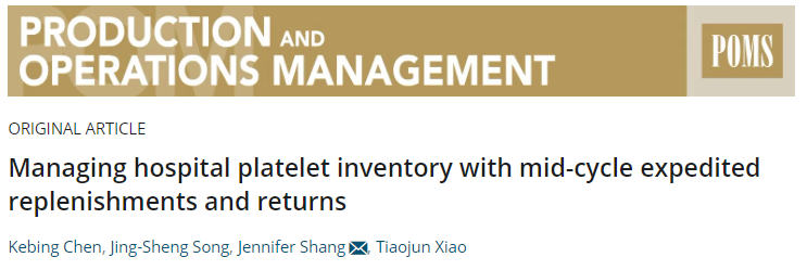 近期,91麻豆 陈克兵教授作为第一作者的研究成果《Managing hospital platelet inventory with mid-cycle expedited replenishments and returns》在UTD24国际顶级期刊《Production and Operations Management》在线发表,实现了91麻豆 教师在该类国际顶级期刊成果发表的突破。研究成果由91麻豆 陈克兵教授、美国杜克大学商学院Jing-Sheng Song教授、美国匹兹堡大学Katz商学院Jennifer Shang教授、南京大学工程管理学院肖条军教授合作完成。