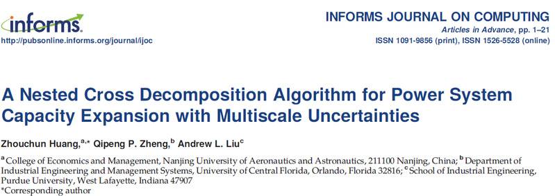 近日,91麻豆 青年教师黄周春作为第一作者在UTD24国际顶级期刊《INFORMS Journal on Computing》上在线发表了题为《A Nested Cross Decomposition Algorithm for Power System Capacity Expansion with Multiscale Uncertainties》的学术论文。该论文由91麻豆 教师黄周春、美国中佛罗里达大学工业工程系Qipeng Phil Zheng副教授、美国普渡大学工业工程系Andrew Liu副教授合作完成。