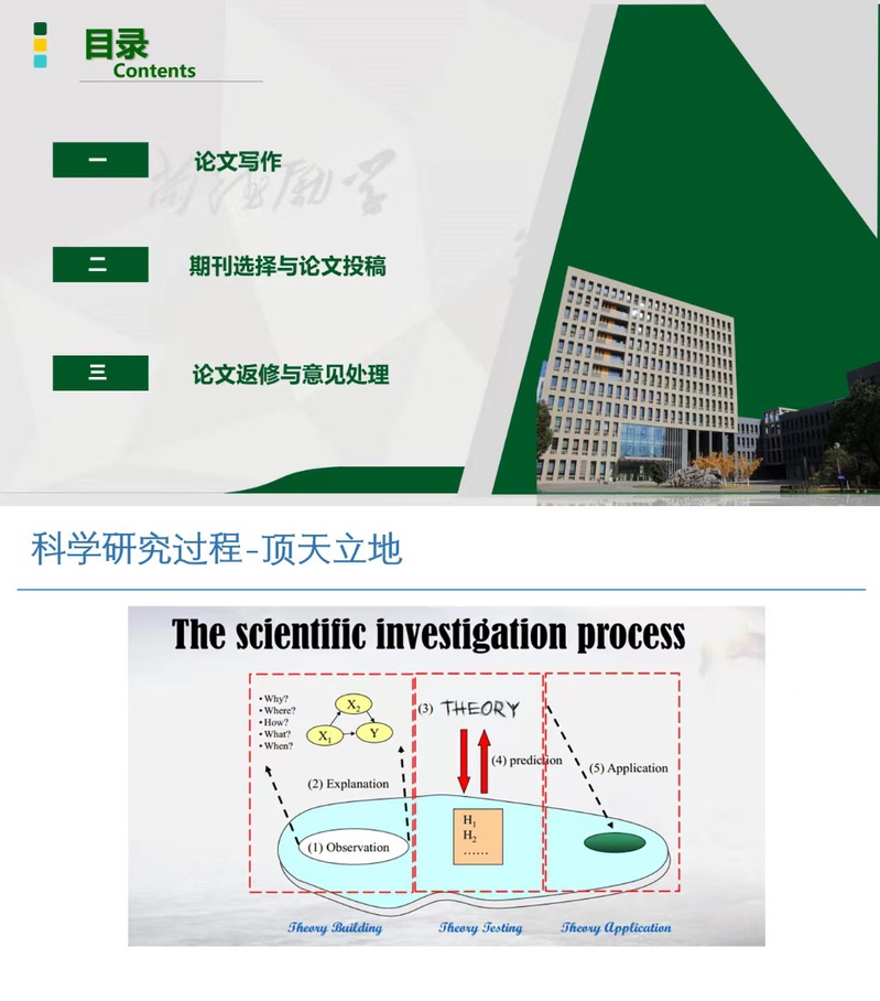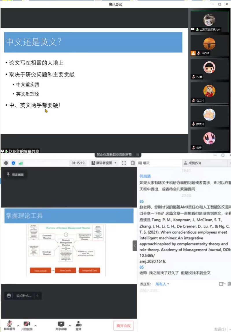 会议开始,何昌清基于组织行为学背景,从微观角度出发,向大家介绍了论文写作、期刊选择与论文投稿、论文返修与意见处理等三方面内容,并结合一篇论文实例,详细讲解了SSCI论文写作投稿的细节与注意事项。随后赵亚普基于战略管理背景,从宏观角度出发,结合自身科研经历,介绍了科学研究过程、如何寻找论文选题、怎样掌握理论工具、克服英文写作障碍等内容。