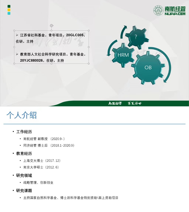 本次会议邀请的主讲人是何昌清和赵亚普。两位老师都曾主持过国家级、教育部、江苏省及博士后等多项基金,并在European Management Journal、Academy of Management等知名期刊及会议发表多篇高水平SSCI论文。他们对于学术论文写作和投稿有着丰富的经验。