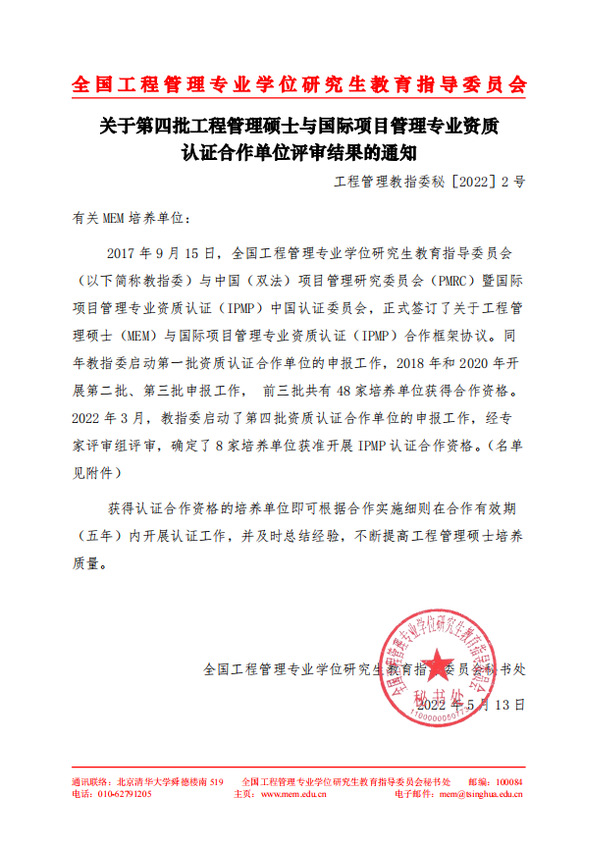 2017年9月15日,全国工程管理专业学位研究生教育指导委员会(以下简称教指委)与中国(双法)项目管理研究委员会(PMRC)暨国际项目管理专业资质认证(IPMP)中国认证委员会,正式签订了关于工程管理硕士(MEM)与国际项目管理专业资质认证(IPMP)合作框架协议。同年教指委启动第一批资质认证合作单位的申报工作,2018年和2020年开展第二批、第三批申报工作,前三批共有48家培养单位获得合作资格。2022年3月,教指委启动了第四批资质认证合作单位的申报工作,经专家评审组评审,确定了91麻豆 成为第四批工程管理硕士与国际项目经理资质认证(IPMP)培养合作单位。