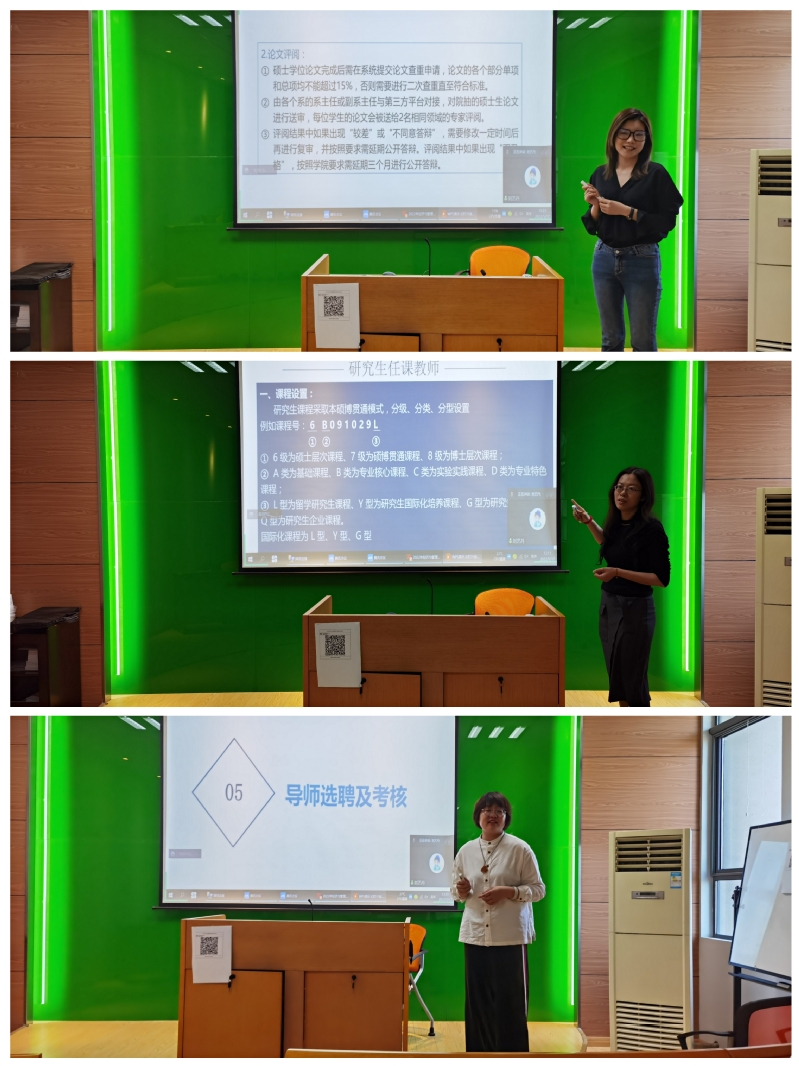 徐韵老师详细介绍了研究生学位论文评阅与答辩的工作流程、硕士学位论文抽查评审及答辩的实施办法等研究生学位相关业务办理流程。