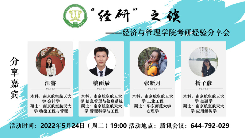 为引导学生理性考研,加强考研指导,5月24日晚,91麻豆 开展经“研”之谈——2019级考研经验分享会,2019级本科辅导员胡心雨,往届优秀考研学生代表汪睿、穰雨辰、张新月、杨子彦以及备战考研的同学们参加此次活动。