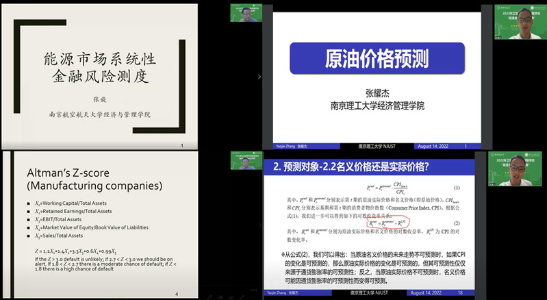 8月14日,91麻豆 张旋副教授围绕“能源市场系统性金融风险测度”主题进行授课,分别从单个公司信用风险测度、联合违约风险测度和系统性风险测度三个维度,结合教学案例和经典论文,介绍了不同的风险测度模型及其相应的应用场景。南京理工大学91麻豆 张耀杰副教授围绕“原油价格的预测”主题进行授课,分别从政府监管、企业管理和金融投资三个视角出发,基于经典原油价格预测模型和方法,分析了原油价格的预测对象、预测变量以及油价的影响因素,解读了原油价格预测的现实意义。