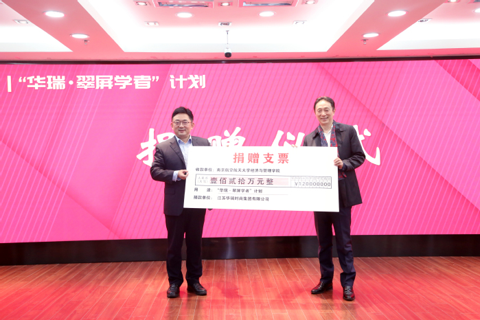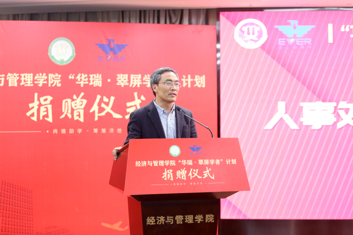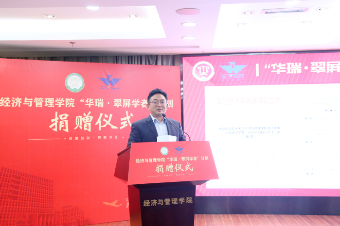启动实施“翠屏学者”计划。2022年11月4日下午,“华瑞•翠屏学者”计划捐赠仪式在经管学院A0305报告厅举行。江苏华瑞时尚集团创始人康宜华校友,华瑞集团财务部、人力资源部相关负责人,校党委副书记、纪委书记杭育新,人事处处长/高级人才办主任崔海涛,学院领导班子成员,院长助理,各系系务委员会成员,各研究所所长,入选校“长空学者”计划人才,校首批百强团队成员,青年教师代表以及博士生代表参加仪式。捐赠仪式由学院党委书记苏州主持。