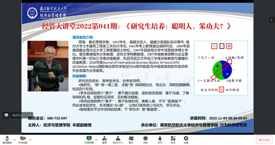 11月9日上午,CJ学者周南教授做客经管学院“经管大讲堂”(2022第041期)分享《研究生培养:聪明人?笨功夫?》的主题讲座。本次讲座由院长周德群教授致辞,副教授丰超主持,经管学院一百多名师生线上线下同步聆听,此外,还吸引了部分外校老师前来聆听。