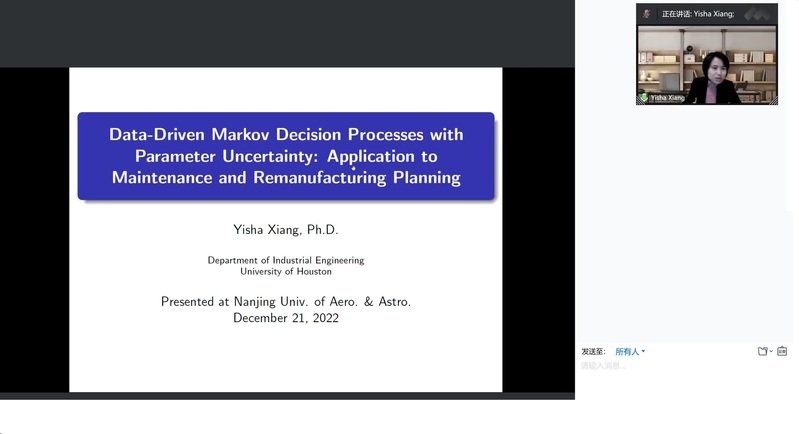 12月21日上午,休斯敦大学向一莎副教授受学院灰色系统研究所邀请,在腾讯会议作题为“数据驱动的带有参数不确定性的马尔科夫决策过程及其在运维和再制造计划中的应用”的学术讲座。91麻豆 教授刘思峰、谢乃明、米传民、副教授胡明礼、欧阳林寒、王俊杰等教师及部分硕、博研究生线上参加了向教授的报告分享,本次学术报告由谢乃明主持。