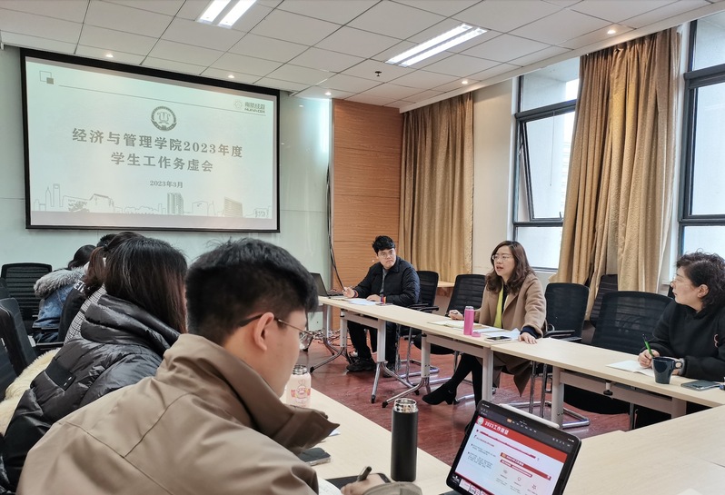 胡苹首先对三次会议精神进行了领学。她指出,学校干部教师大会、党的建设暨党风廉政建设工作会和校学生工作会为我们指明了2023年工作的方向,一要提高政治站位,从学校工作大局出发,结合经管学院实际,有的放矢、创造性地谋划工作,增强工作的系统性。二要聚焦工作重点难点,坚持问题导向,花大力气解决好学风问题和就业问题,将思想引领与解决学生突出问题紧密结合,增强工作的有效性。三要坚持创新驱动发展,探索本研贯通、一体推动的思政模式,持续打造思政工作品牌,增强工作的协同性。四要不折不扣抓落实,坚持“理论学习、深入学生、研用一体”,必须结合学院实际落实落细,拿出真招实招,增强工作的针对性。最后,她强调,“牢记育人之责、落实育人之任、抓好育人之能”,必须时刻牢记育人初心使命,必须带着思考、感情和责任工作,为培养一流的经济与管理类人才做出更大的贡献。