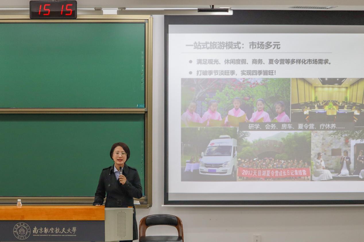 接着,王婷讲述了自身的职业发展经历,分享自己11年如何一步步从一名公司实习生走到如今集团骨干的成长经历。王婷语重心长地告诉大家平台、导师、领导对于自身的重要性。她详细的介绍了江苏天目湖旅游公司迅猛的发展历程、卓越的业内成绩、人性化的员工管理体系、以及博爱的公益举措等使得企业能够成为近五年首家主板上市旅游企业、中国第一家国家级水利风景区上市公司、江苏省第一家景区类上市公司。