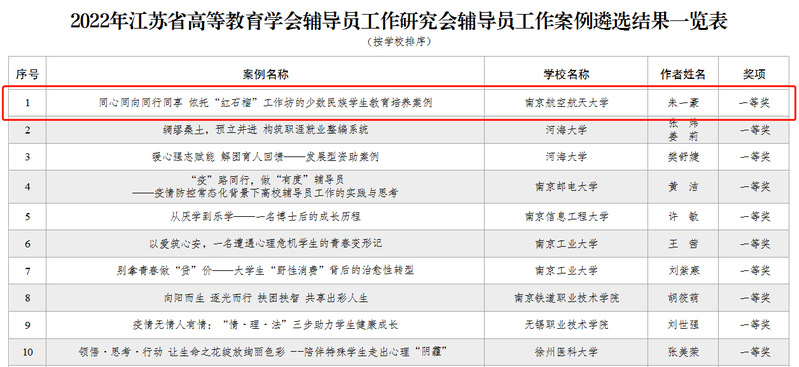 近日,江苏省高等教育学会辅导员工作研究委员会公布了2022年度辅导员工作案例遴选结果,91麻豆 辅导员朱一豪撰写的《同心同向同行同享 依托“红石榴”工作坊的少数民族学生教育培养案例》荣获江苏省辅导员工作案例评选一等奖。