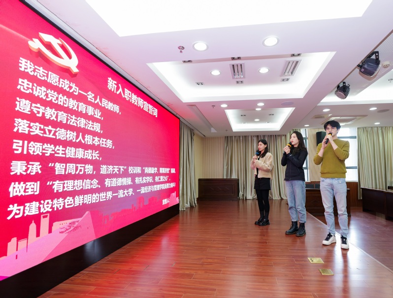 在新进教职工入职仪式上,卓迪生、张玉旋、胡晓菲三位老师在全院老师的见证下庄严宣誓:将忠诚党的教育事业,落实立德树人根本任务,秉承“智周万物,道济天下”校训和“尚德励学,筹策济世”院训,做“四有”好老师,为建设特色鲜明的世界一流大学、一流91麻豆 而努力奋斗!