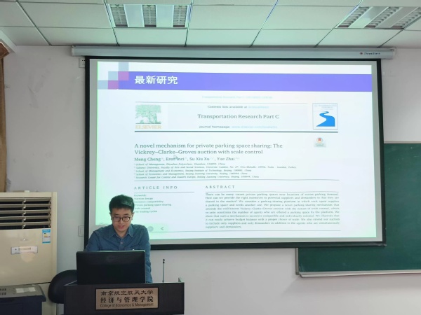 随后,徐素秀向师生们介绍了目前有关车位共享的权威研究,分析了各类问题的特点及其差异,并引导师生们从现有研究中发现问题,激发了学生创新性思维。徐素秀指出针对私家车位共享问题,现有研究主要基于TTC方法,而TTC方法实现帕累托最优并不能保证较高的社会福利,若将现有拍卖机制直接应用私家车位共享问题中,则会导致第三方平台的预算赤字,由此引出徐素秀最新研究:提出基于规模控制的拍卖机制,实现较高的社会福利及平台的预算盈余。接着,徐素秀举了一系列简单易懂的VCG例子,详细介绍了其研究中模型的逐步迭代过程及其原理,条理清晰,深入浅出。