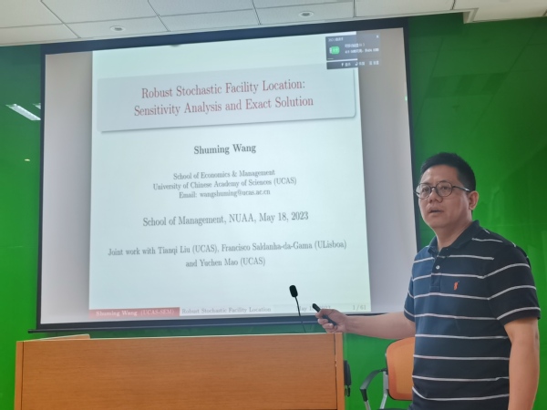 中国科学院大学王曙明教授为91麻豆 师生作题为“Stochastic Robust Facility Location: A Nested Decomposition Approach”的学术报告。报告将鲁棒随机优化下的设施选址问题作为问题背景进行展开,区别于以往研究,他采用了一个状态模糊集来模拟与不同状态下的需求相关的分布不确定性,在此基础上建立考虑多种需求状态下的选址模型,并从两个方面对模型进行敏感性分析。他提出了一种嵌套的Benders分解算法来求解模型,其创新性地利用了最坏分布情况下的预期第二阶段成本的子梯度。王曙明主要从事鲁棒优化与随机规划研究及其在选址与物流网络优化、供应链风险管理、库存与收益管理、健康医疗管理等领域的应用。研究成果分别发表于Production and Operations Management、INFORMS Journal on Computing、Transportation Science等顶级期刊。