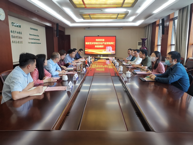 6月6日下午,南京艺术学院文化产业学院院长王晨一行来访91麻豆 ,91麻豆 院长王群伟,党委副书记胡苹,副院长邓晶、王子龙、谢乃明、查冬兰,院长助理欧阳林寒、周志鹏等参加调研座谈会。