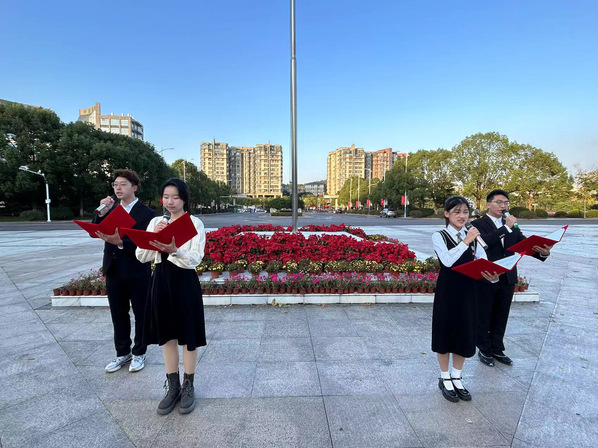 “透过历史的眼眸,我们站在岁月的肩膀上远眺;在黄河壶口的惊涛里,我们听到一种经久不息的激情。”大一年级学生胡静怡、左嘉琪、陆霄阳、王家玺带来配乐诗朗诵《祖国颂》,铿锵字句中,华夏五千年的宏伟画卷在我们眼前徐徐展开:涓涓不塞,是为江河;源源不断,是为奋斗;生生不息,是为中国。