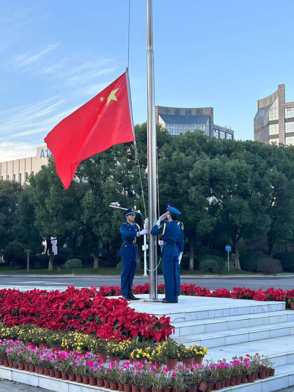 铿锵正步踏碎晨曦寂静,嘹亮口号喊醒内心灵魂。清晨七时整,升国旗仪式正式开始。国旗仪仗队的同学们迈着整齐划一、铿锵有力的步伐,护送着五星红旗正步走向旗杆。全体师生面向国旗肃立致礼。随着激昂的《义勇军进行曲》,师生们注视着五星红旗冉冉升起,在熠熠晨光中迎风飘扬。