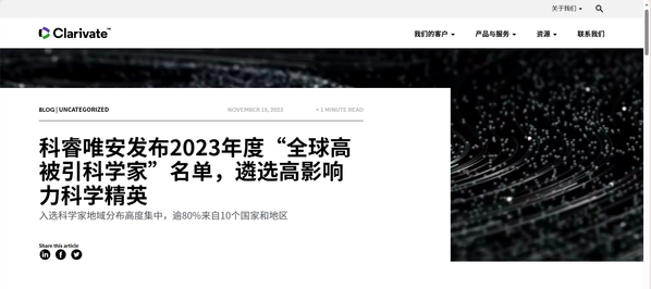 高被引科学家的遴选方法论由科睿唯安科学信息研究所 (ISI) 的文献计量学专家和数据科学家基于Web of Science™引文数据及其分析而制定。入选“高被引科学家”名单的科学家的论文被引频次在 Web of Science™ 中位于同学科、同发表年份的前1%,入选者皆为全球高校、研究机构和商业组织中对所在研究领域具有重大和广泛影响的顶尖科学人才。
