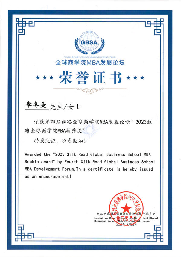 MBA学员李冬美获得“2023丝路全球商学院MBA新秀奖”
