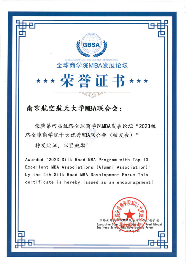南航MBA联合会获得“2023丝路全球商学院十大优秀MBA联合会”
