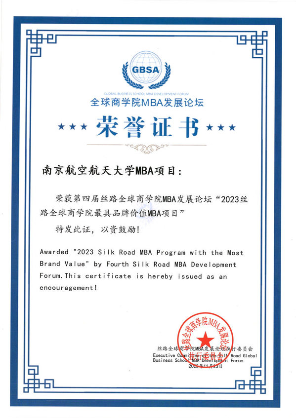 南航MBA项目获得“2023丝路全球商学院最具品牌价值MBA”