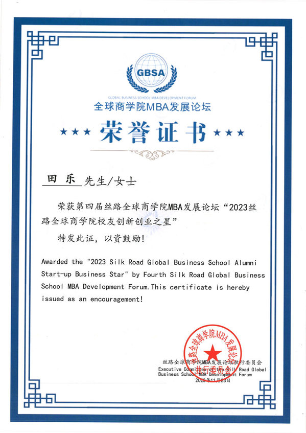 MBA学员田乐获得“2023丝路全球商学院校友创业创新之星”