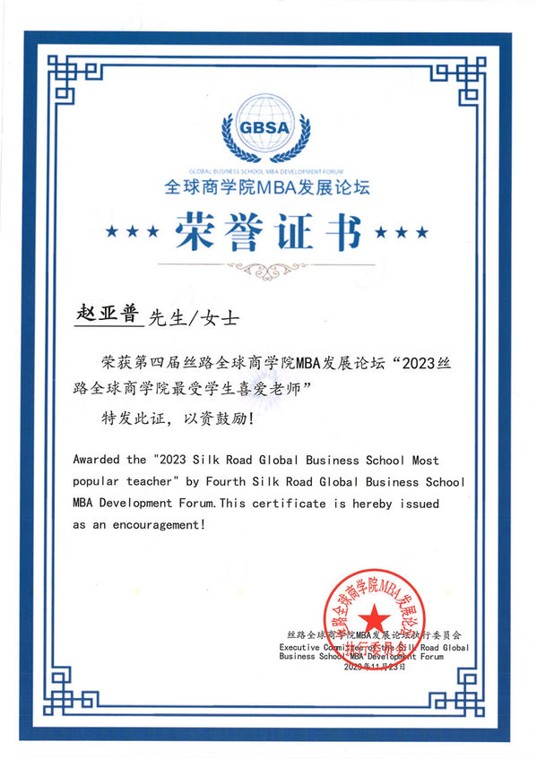 赵亚普老师获得“2023丝路全球商学院最受喜爱教师”