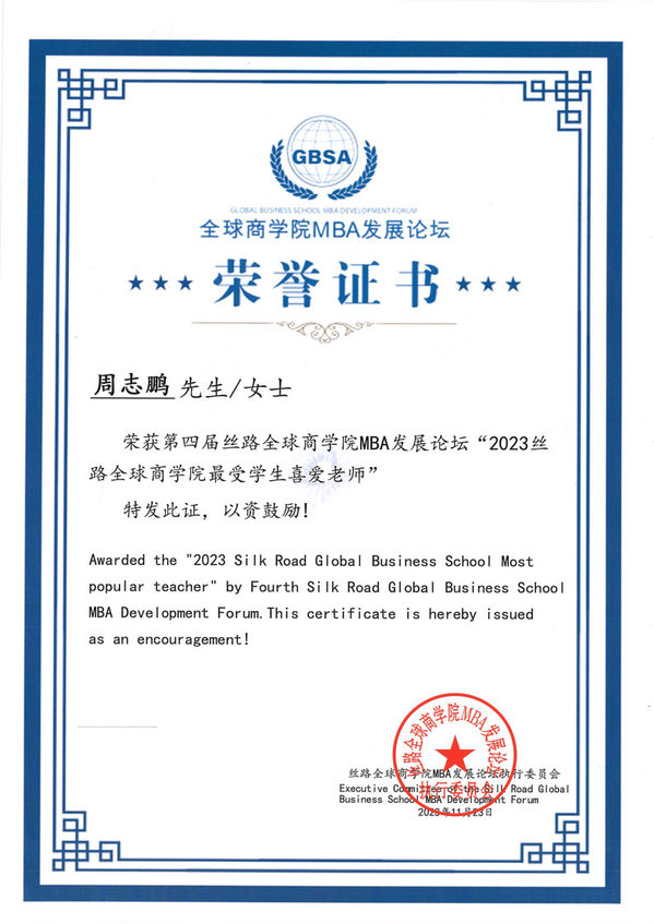 周志鹏副院长获得“2023丝路全球商学院最受喜爱教师”