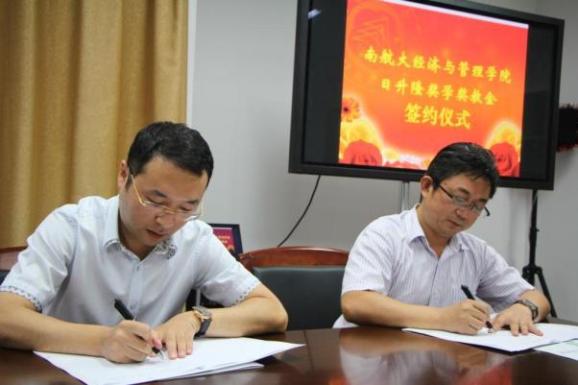 为了回馈母校,给更多的经管学生搭建创新创业的平台,经管2002级院友南京市江宁区日升隆农村小额贷款公司董事长刘生海于2014年向学院捐赠,与学院共同建设了“W&M” 悦咖啡馆,一年来,咖啡馆由学生自主经营,承接了无数次的学生活动,成为南航“最有逼格”的场地之一,营业收入十余万元。2015年,学院与日升隆达成共识,将营业所得服务于学生成长成才及学院建设发展,在学院成立“日升隆奖学奖教金”。9月29日下午,经管学院“日升隆奖学奖教金”签约仪式顺利举行,日升隆农村小额贷款公司董事长刘生海,总经理魏卓,经管学院院长周德群,院党委书记焦宏图,副书记许静,副院长张卓、王英、朱建军,咖啡馆店长张燕等人参加了签约仪式。